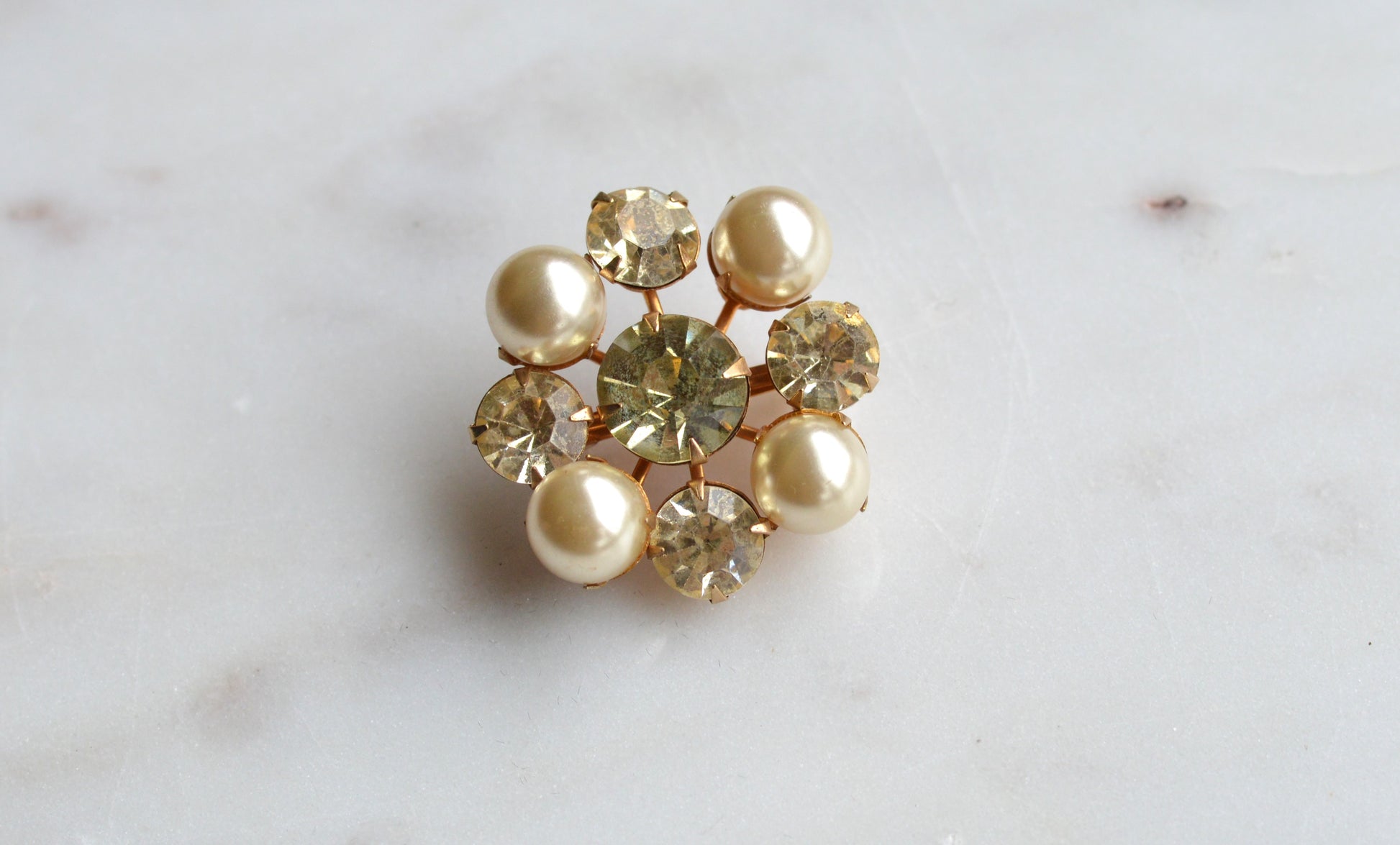 Pretty vintage faux pearl and rhinestone cluster brooch in a warm gold-tone setting. The design features creamy round faux pearls paired with sparkling champagne-toned rhinestones around a larger center stone for lots of light-catching shine.