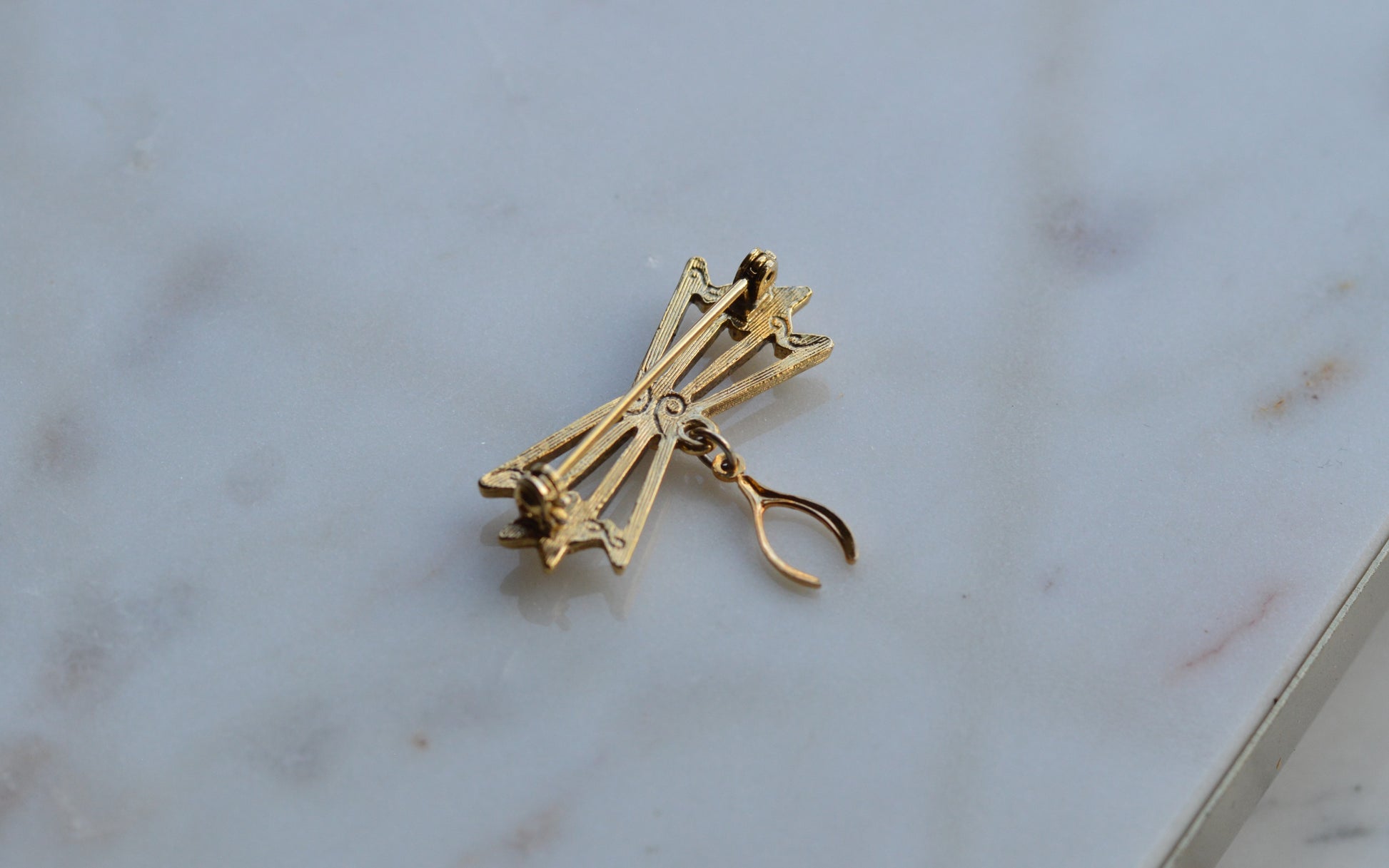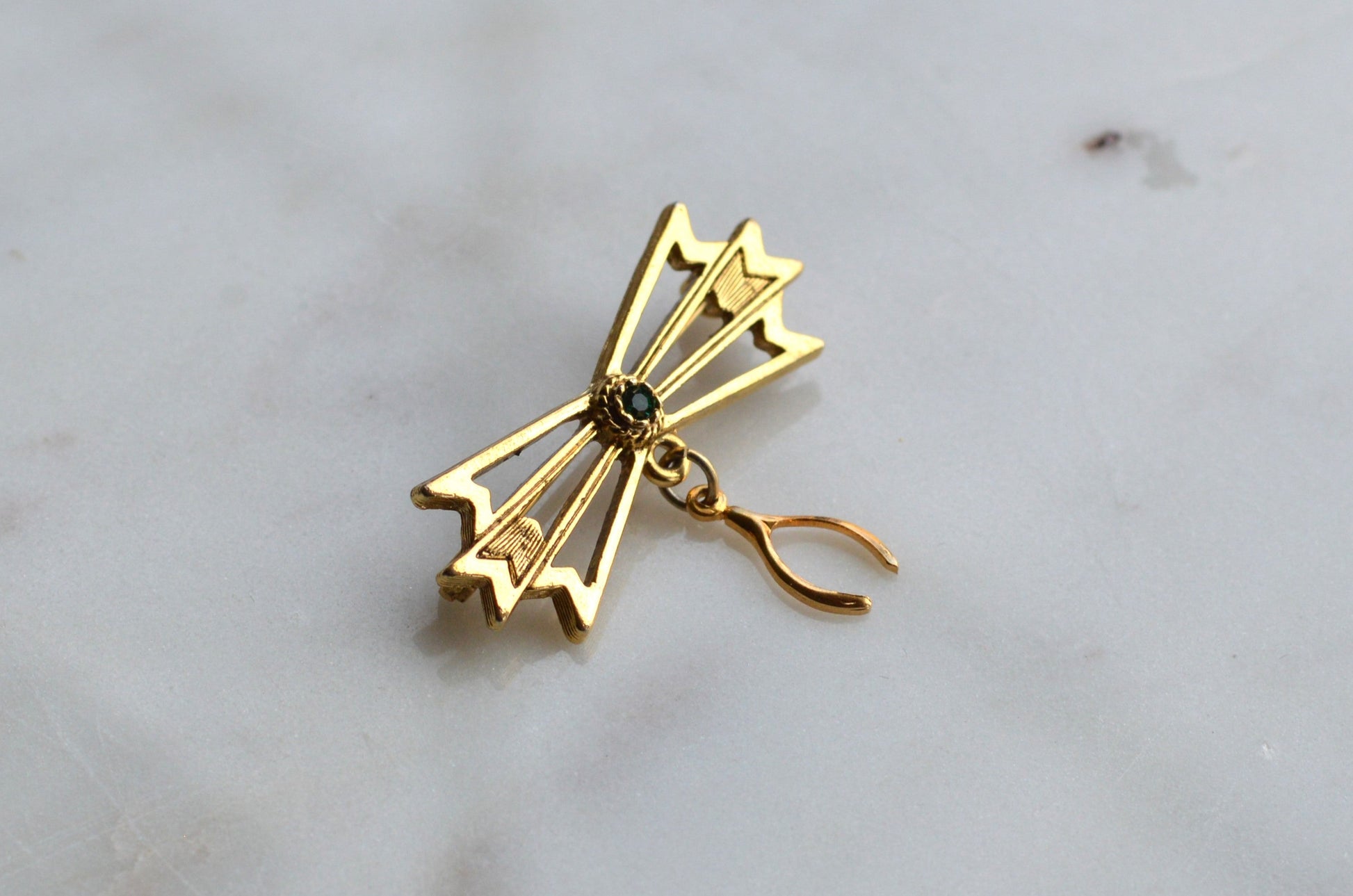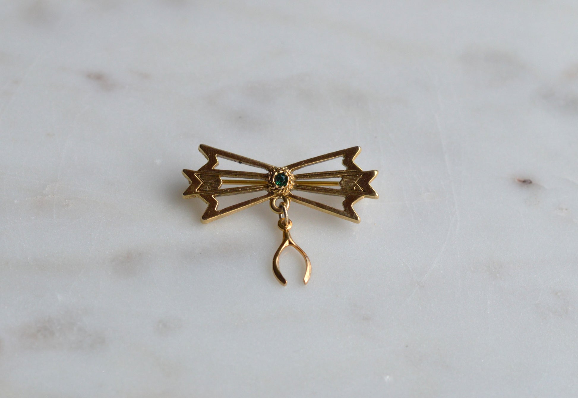 Vintage Gold Tone Wishbone & Bow Brooch - Good Luck Charm Pin - Emerald Green Rhinestone Accent - Mid Century Sentimental Jewelry - Dangle Pin