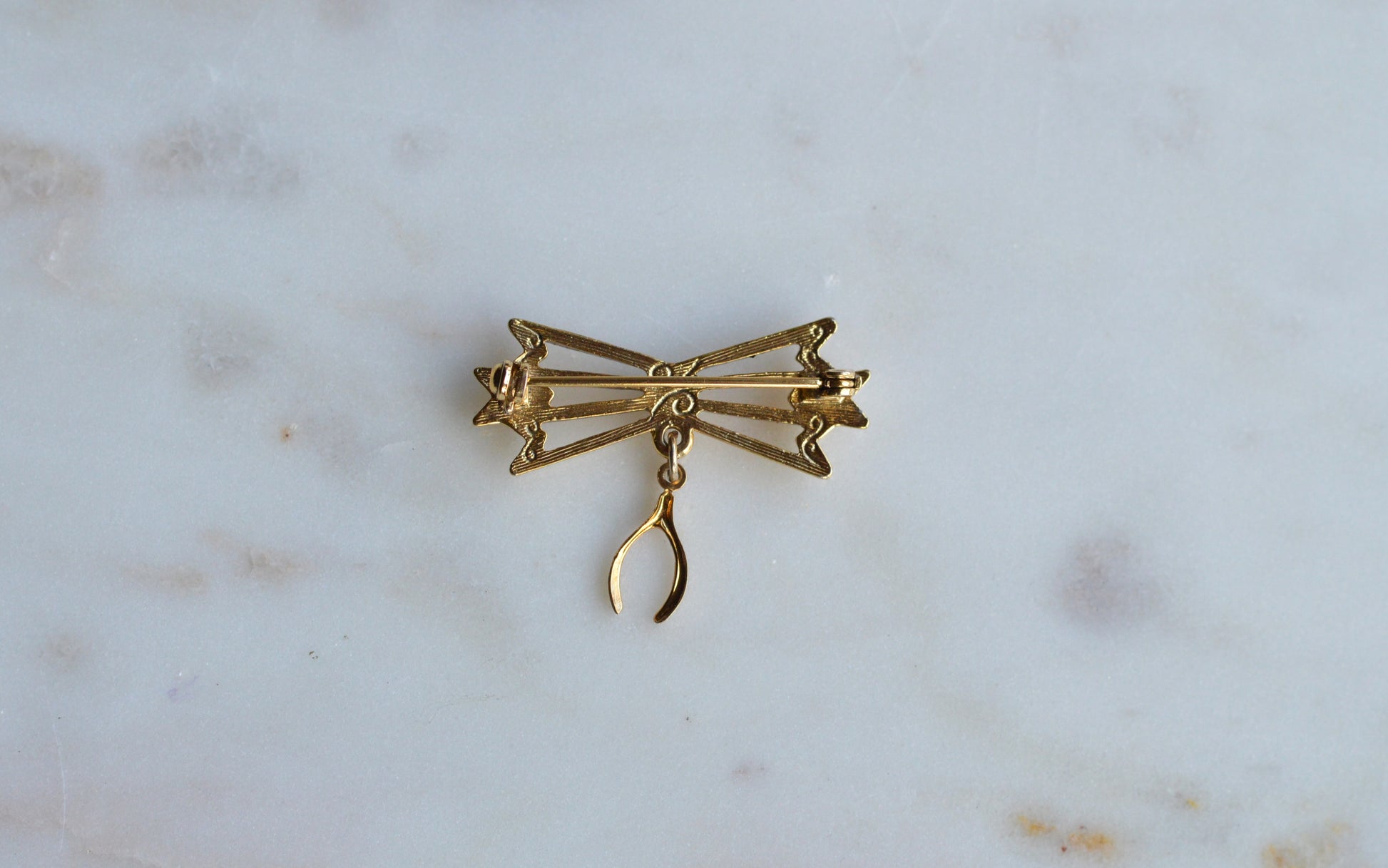 Suspended from the bottom of the bow is a dainty, polished wishbone dangle, a traditional symbol of luck and hope. This dimensional pin is a perfect example of mid-century sentimental jewelry, ideal for a graduate, a bride, or anyone starting a new chapter.