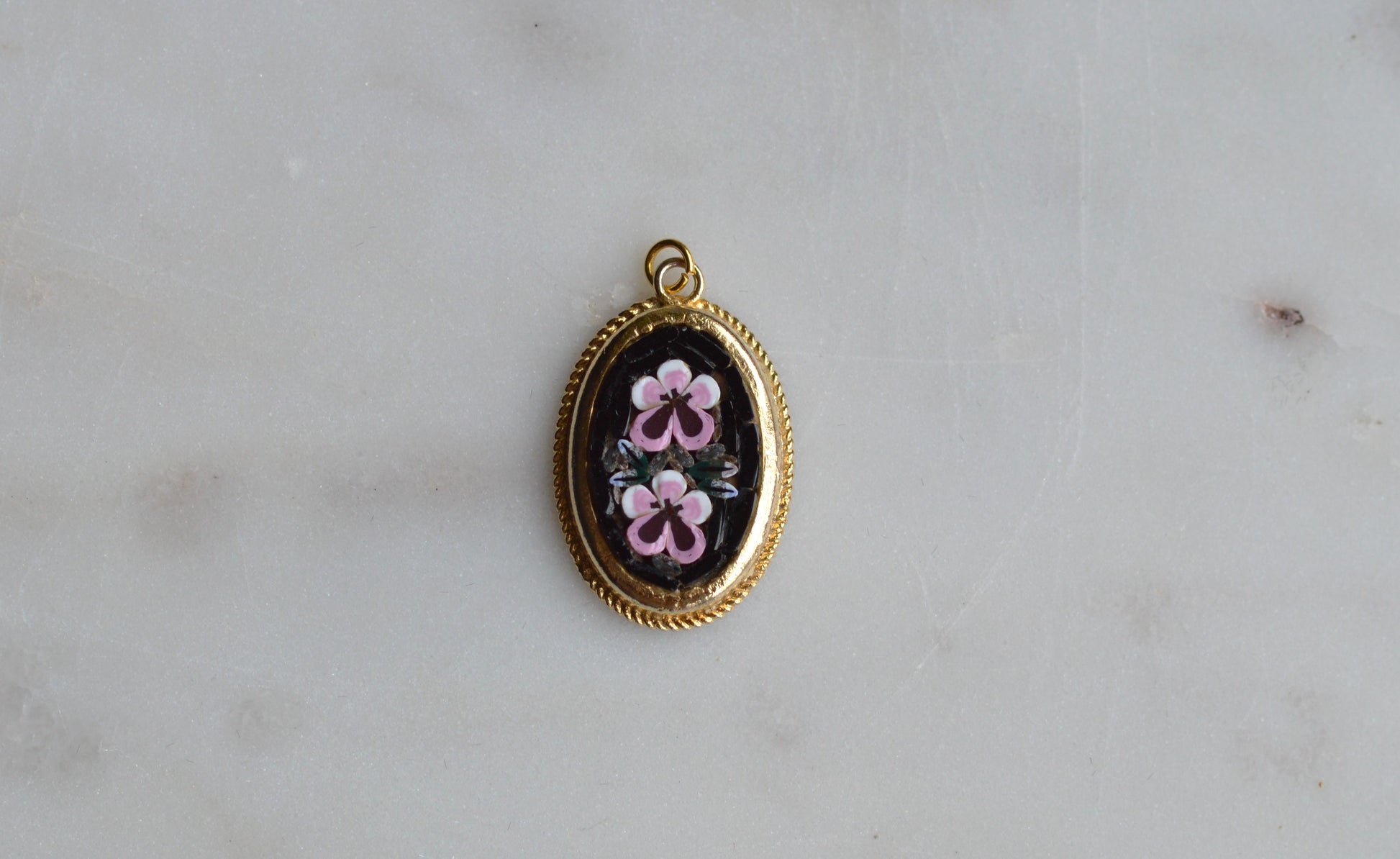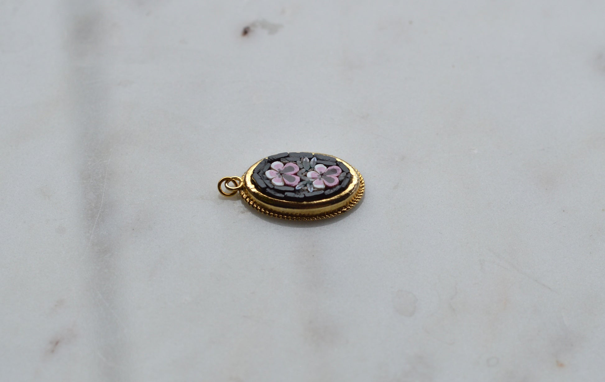A charming piece of wearable art, this vintage micro mosaic pendant showcases the incredible skill of Italian artisans. The oval face features a hand-placed arrangement of tiny glass tesserae, forming two delicate pink blossoms against a striking jet-black background.