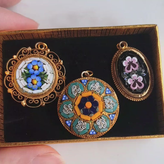 The mosaic is beautifully framed in a classic gold-toned rope-twist border and includes a small bale at the top, ready to be added to your favorite gold chain. These pieces were famously collected as "Grand Tour" souvenirs and remain a timeless staple of romantic, feminine style.
