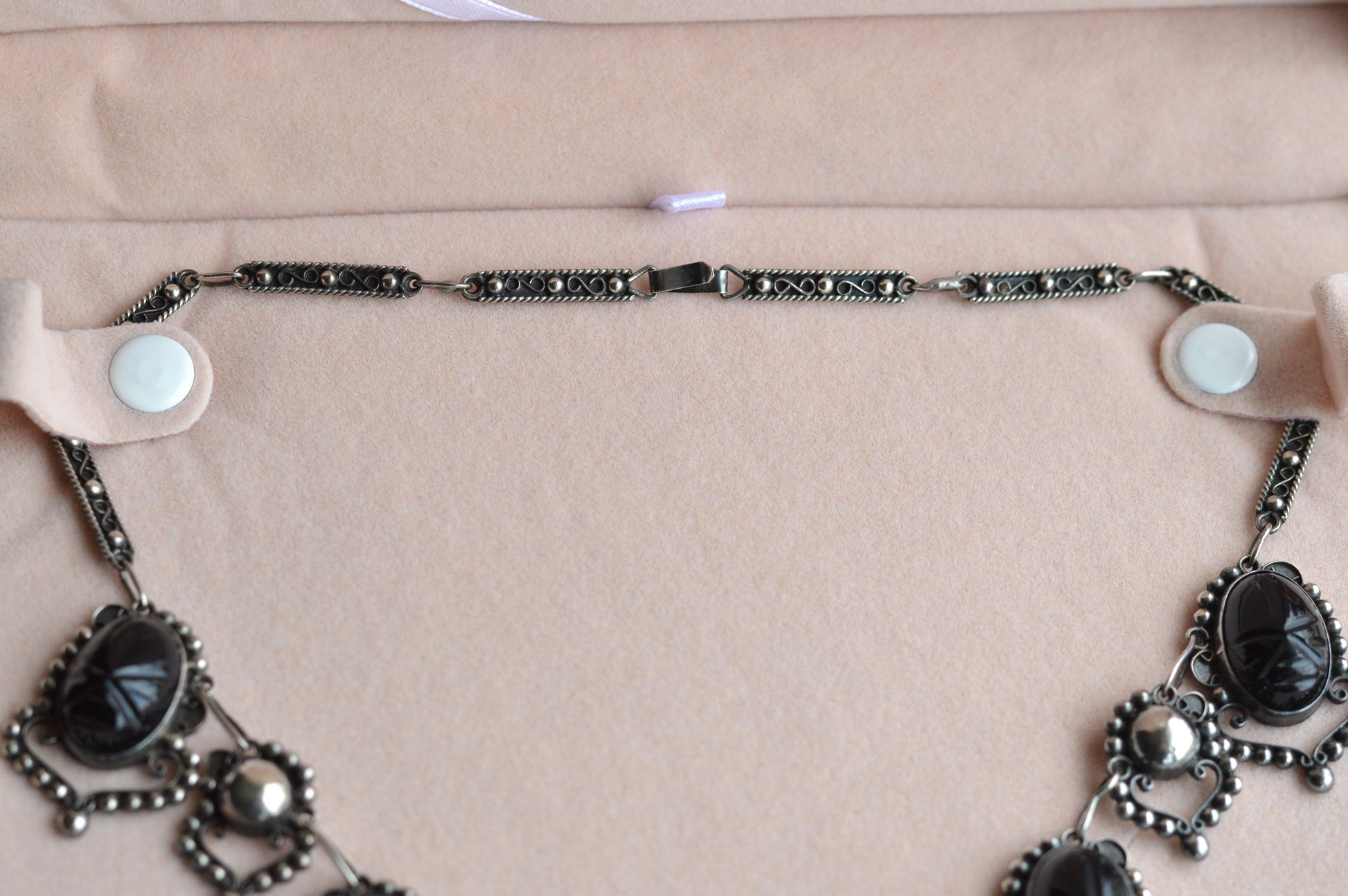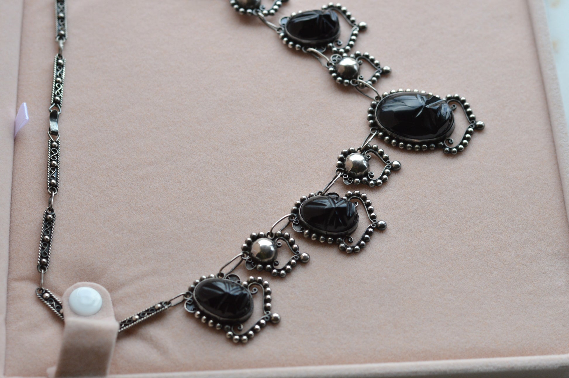 Condition: Excellent vintage condition. All onyx carvings are crisp and secure; the silver has a rich, authentic patina.