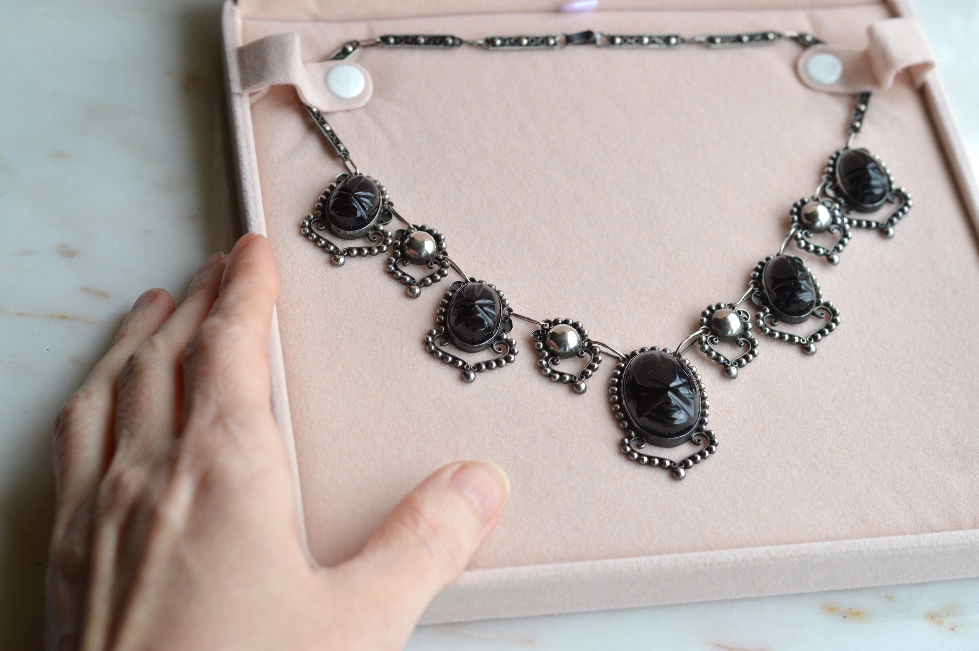 Vintage Mexican Sterling Silver Onyx Scarab Necklace - Signed JJG Co Mexico 925 - Egyptian Revival Festoon Fringe - Hand Carved Taxco Style Jewelry
